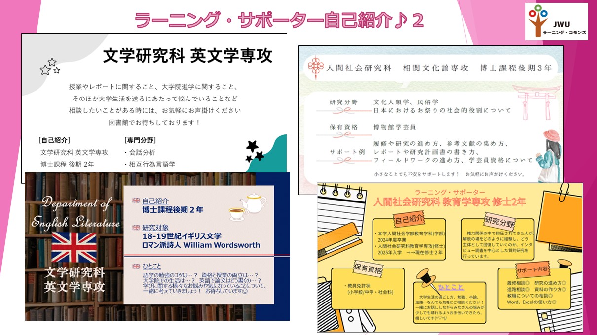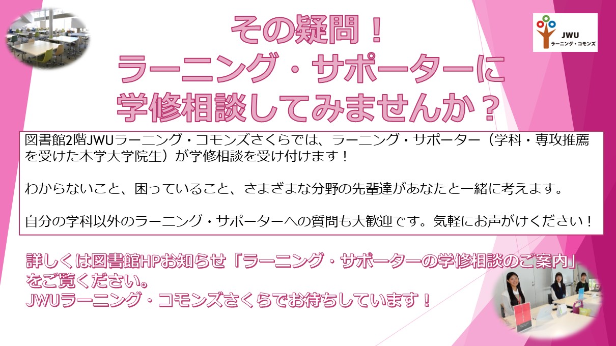 図書館2階JWUラーニング・コモンズさくらでは、ラーニング・サポーター(学科・専攻推薦を受けた本学大学院生)が学修相談を受け付けます。